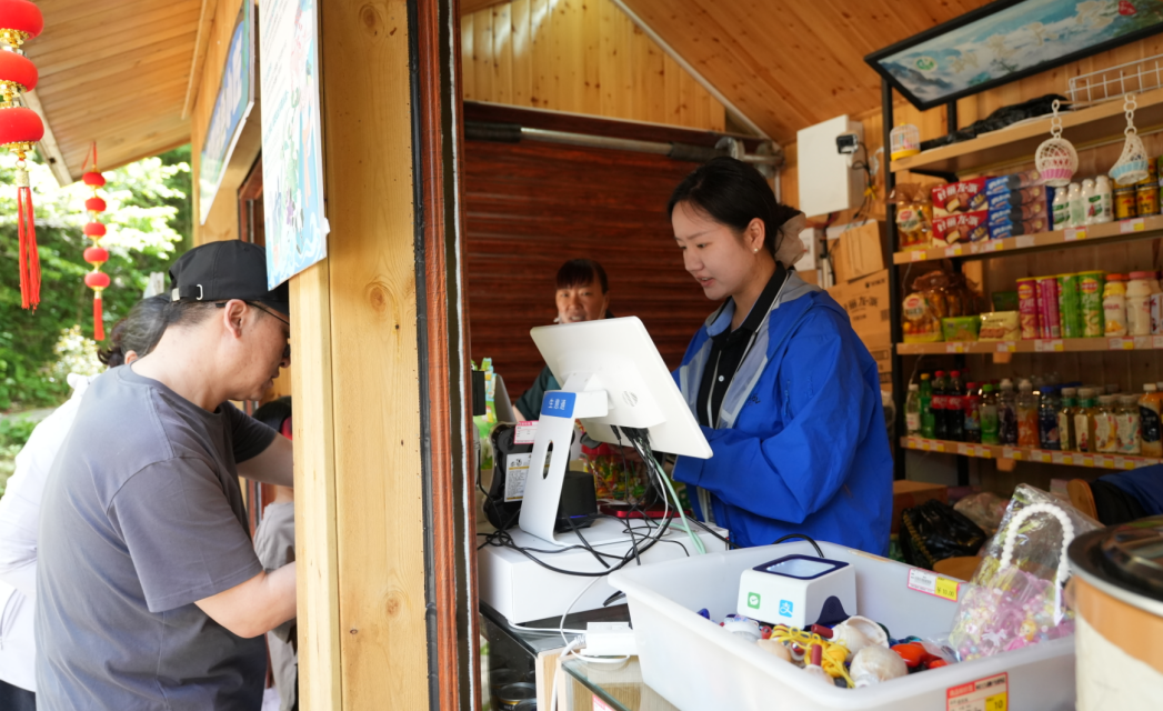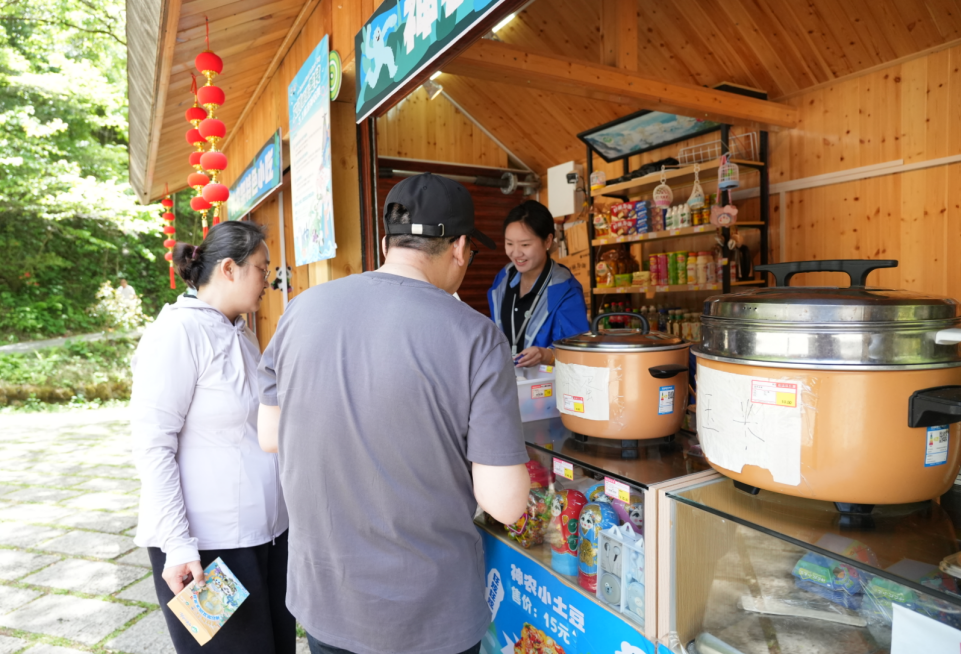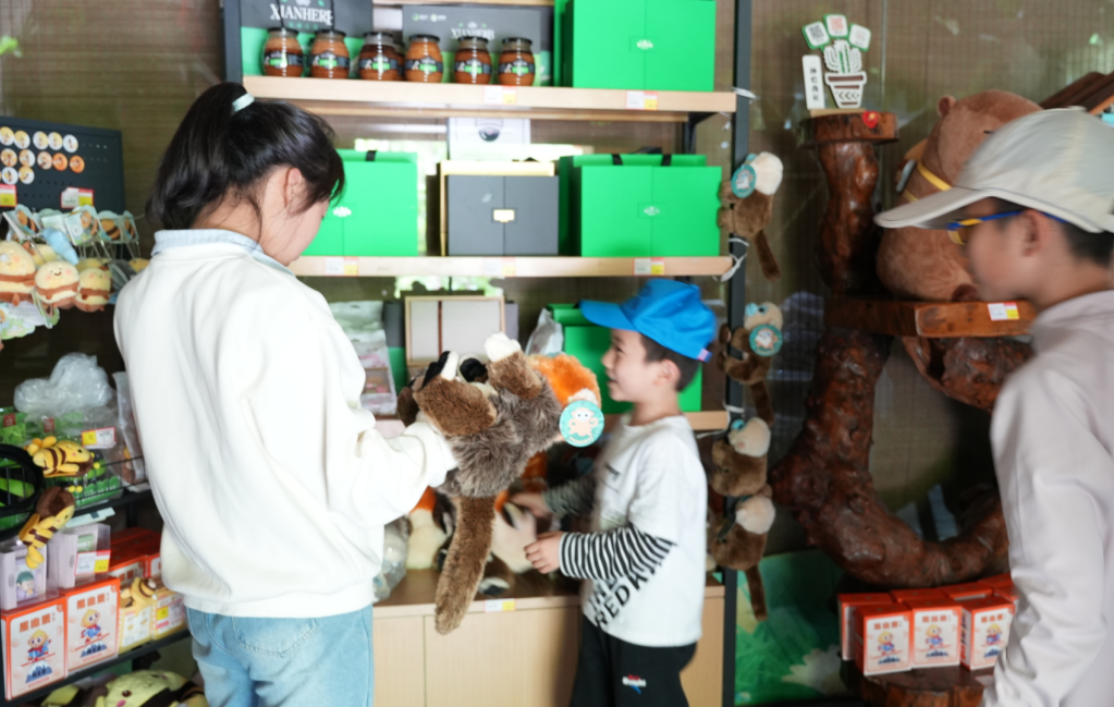 在熊猫馆文创店,店长黄庆玉正在热情向小朋友介绍熊猫玩偶、熊猫挂件等产品,在她的介绍下,一个个小朋友很快购买了钟意的产品。同样在养蜂人家的店长候利梅也使出浑身解数,耐心地为游客介绍金丝猴玩偶价格、展示蓝面金丝猴的独特之处,生动精彩地介绍瞬间收获了一批“粉丝”下单。